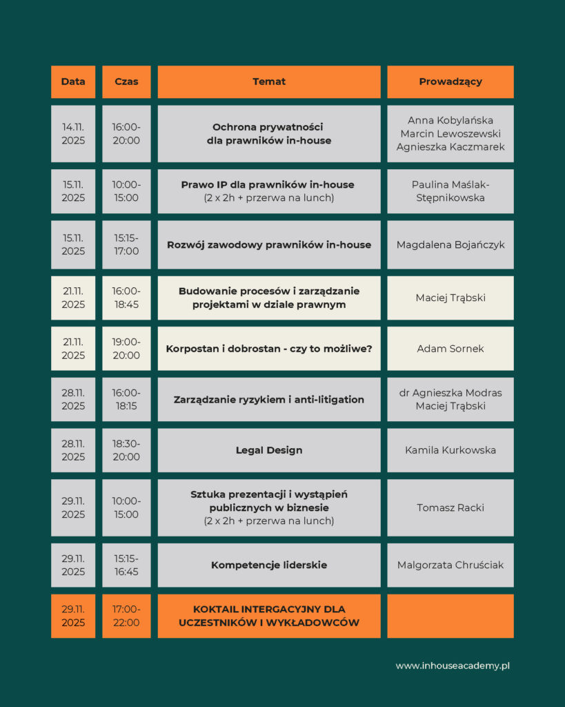 Po zakończeniu In-house Academy, zapraszamy serdecznie wszystkich uczestników i wykładowców na koktajl integracyjny w ramach inicjatywy In-house Space.